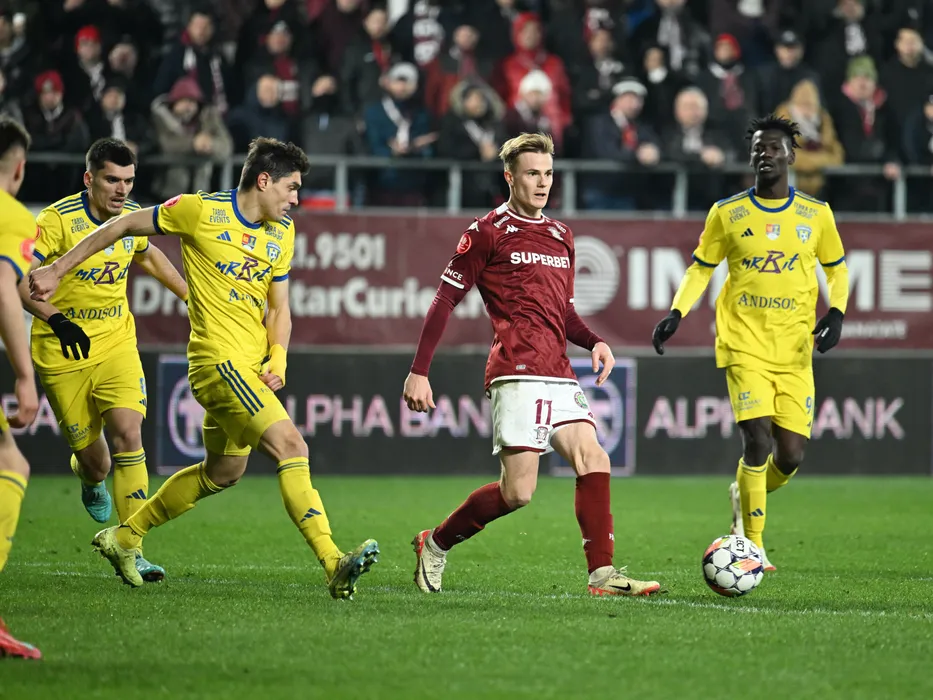 Ionut Alexandru Dinu, Marius Paul Antoche, Tobias Christensen si Nkama Christ Afalna in meciul de fotbal dintre Rapid Bucuresti si Unirea Slobozia, din cadrul Superligii Superbet, desfasurat pe Superbet Arena-Giulesti din Bucuresti, marti 4 februarie 2025. © FOTO:Razvan Pasarica/SPORT PICTURES