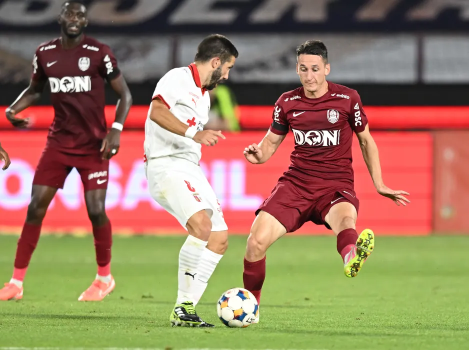 João Moutinho si Alin Razvan Fica in meciul de fotbal dintre FC CFR 1907 Cluj si SC Braga, contand pentru UEFA League Turul 3 preliminar, desfasurat pe Stadionul Dr. Constantin Rădulescu din Cluj-Napoca, joi 7 august 2025. © FOTO: Flaviu Buboi/SPORT PICTURES