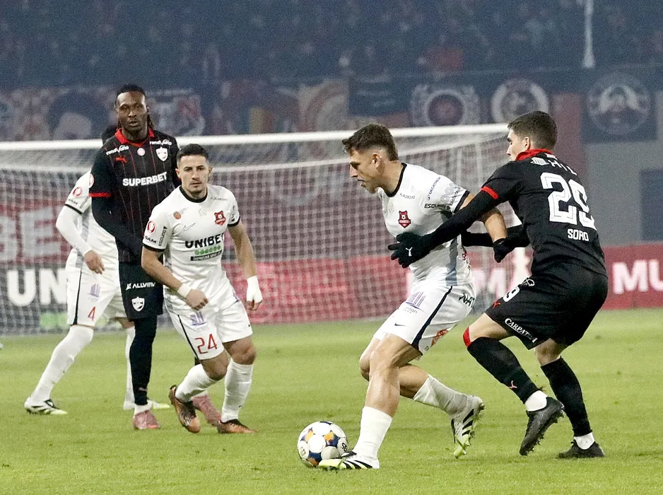 Constantin Dragos Albu, Antoni Valeri Ivanov si Alberto Soro Alvarez, Mamoudou Karamoko in meciul de fotbal dintre AFC Hermannstadt Sibiu si Dinamo Bucuresti, contand pentru Superliga Superbet, desfasurat pe Stadionul Municipal din Sibiu, vineri 23 ianuarie 2026. © FOTO:Valentin Macrea/SPORT PICTURES