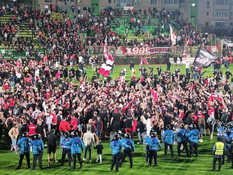 Faceți loc, vin câinii roșii! Promovarea lui Dinamo în Superliga a declanșat nebunia la Mioveni: fanii alb-roșilor au invadat terenul! VIDEO