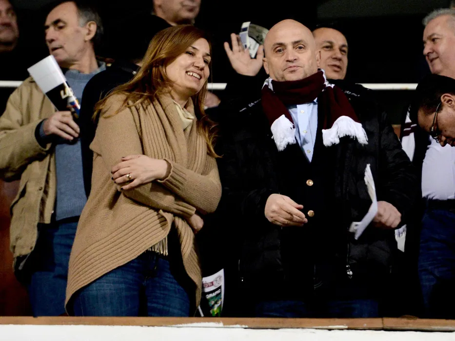 Valerii Moraru, actionar majoritar al echipei Rapid bucuresti, impreuna cu sotia sa, Nicoleta Moraru, asteapta inceperea meciului cu Petrolul Ploiesti.