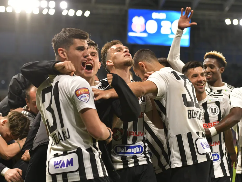 Bucurie a fotbalistilor clujeni cu Marius Florian Ciobanu, Florian Haita, Martin Remacle, Paul Ovidiu Pirvulescu si Ely Fernandes Lopes dupa un gol marcat in meciul de fotbal dintre Steaua Bucuresti si Universitatea Cluj, contand pentru Play-off-ul Ligii a-2-a Casa Pariurilor, desfasurat pe Stadionul Steaua-Ghencea din Bucuresti, miercuri 4 mai 2022. © FOTO:Razvan Pasarica/SPORT PICTURES