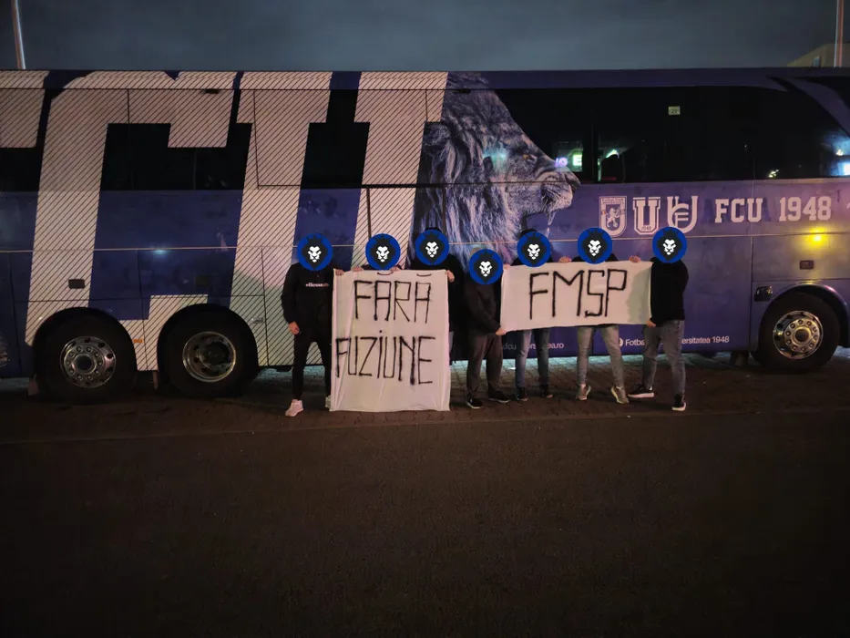 Fanii din Sibiu ai Universităţii Craiova au afişat mesaje anti-fuziune lângă autocarul echipei rivale, FC U