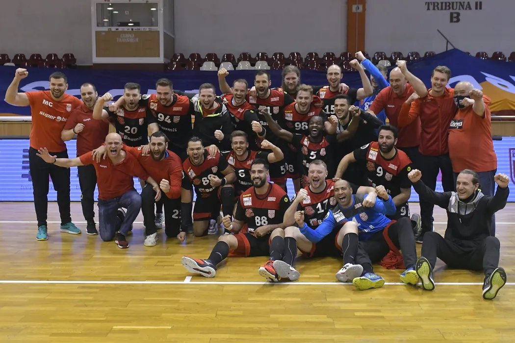 Handbalistii dinamovisti alaturi de staff se bucura dupa castigarea unui nou titlu de campioana a Romaniei in urma meciului de handbal masculin dintre Minaur Baia Mare si Dinamo Bucuresti, contand pentru Turneul Liga Zimbrilor, desfasurat fara spectatori in Sala Rapid din Bucuresti, sambata 8 mai 2021. © FOTO:Razvan Pasarica/SPORT PICTURES