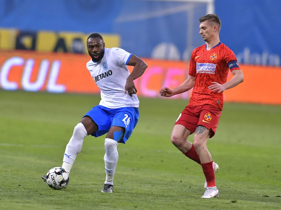 Stephane Ghislain Acka si Florin Lucian Tanase in meciul de fotbal dintre Universitatea Craiova si FCSB, contand pentru Play-off-ul Ligii 1 Casa Pariurilor, desfasurat fara spectatori pe Stadionul Ion Oblemenco din Craiova, joi 29 aprilie 2021. © FOTO:Razvan Pasarica/SPORT PICTURES