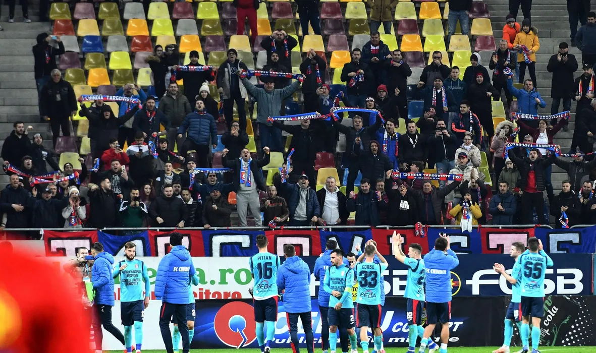 Fotbalistii Chindiei saluta galeria dupa meciul de fotbal dintre FCSB si Chindia Targoviste, contand pentru Liga 1 Casa Pariurilor, disputat pe Arena Nationala din Bucuresti, sambata 22 februarie 2019. © FOTO:Razvan Pasarica/SPORT PICTURES