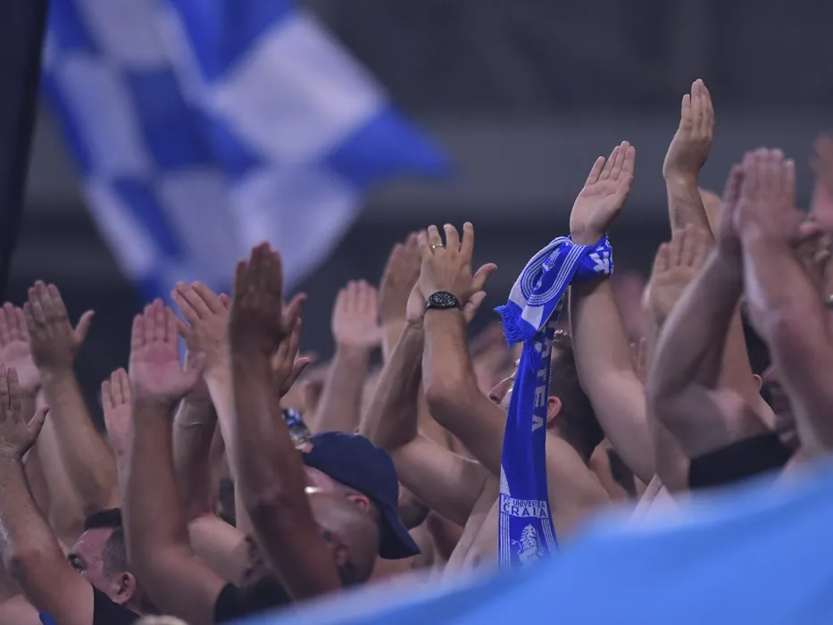 Suporterii craioveni isi incurajeaza favoritii in meciul de fotbal dintre FC U Craiova si Universitatea Craiova, contand pentru Superliga Superbet, desfasurat pe Stadionul Ion Oblemenco din Craiova, duminica 7 august 2022. © FOTO:Razvan Pasarica/SPORT PICTURES