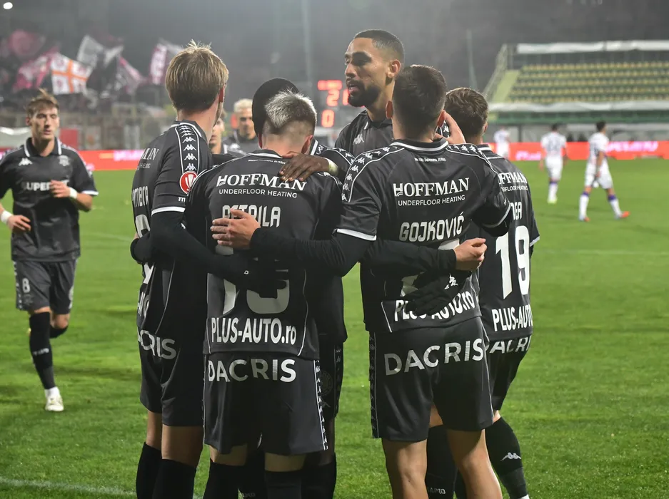 Fotbalistii rapidisti se bucura dupa un gol marcat in meciul de fotbal dintre FC Arges si FC Rapid Bucuresti, contand pentru Cupa Romaniei Betano, desfasurat pe Stadionul Orasenesc din Mioveni, marti 2 decembrie 2025. © FOTO:Mihai Nitoiu/SPORT PICTURES