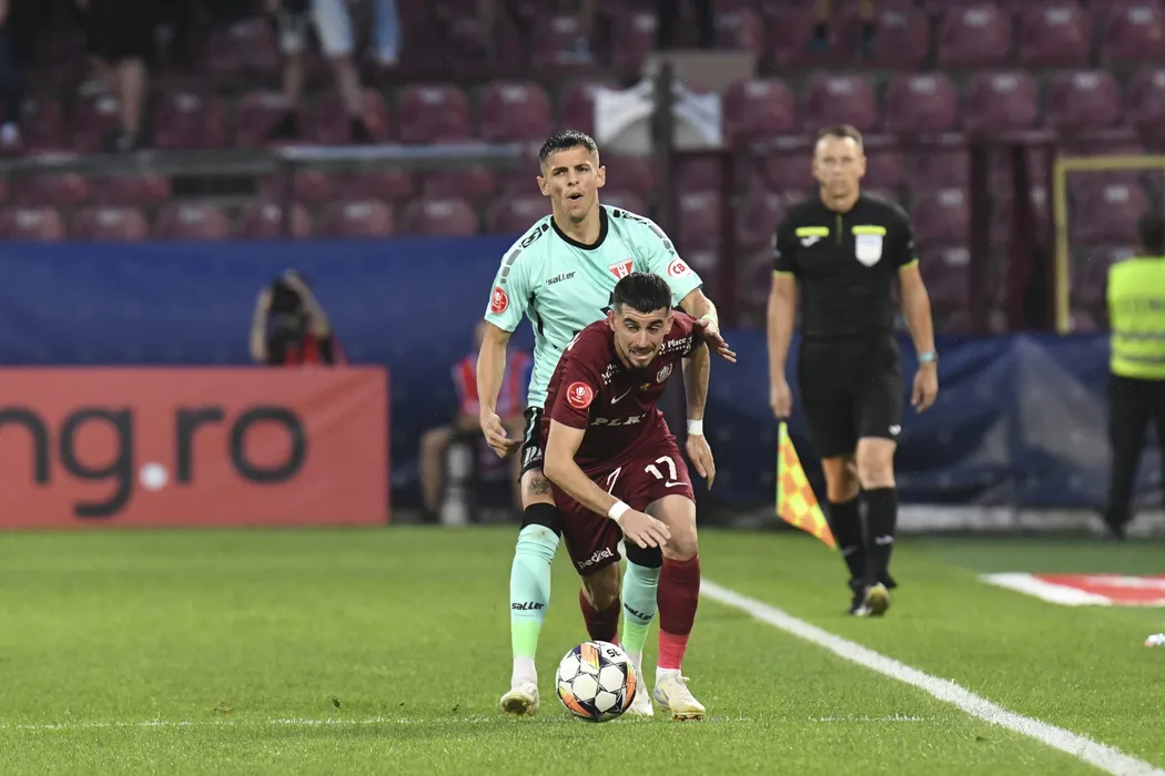 Meriton Korenica și George Alexandru Cîmpanu în meciul de fotbal dintre FC CFR 1907 Cluj si UTA Arad, contând pentru Superliga Superbet, desfășurat pe Stadionul Dr.Constantin Rădulescu din Cluj-Napoca, sâmbătă 28 septembrie 2024. © FOTO: Flaviu BUBOI/SPORT PICTURES
