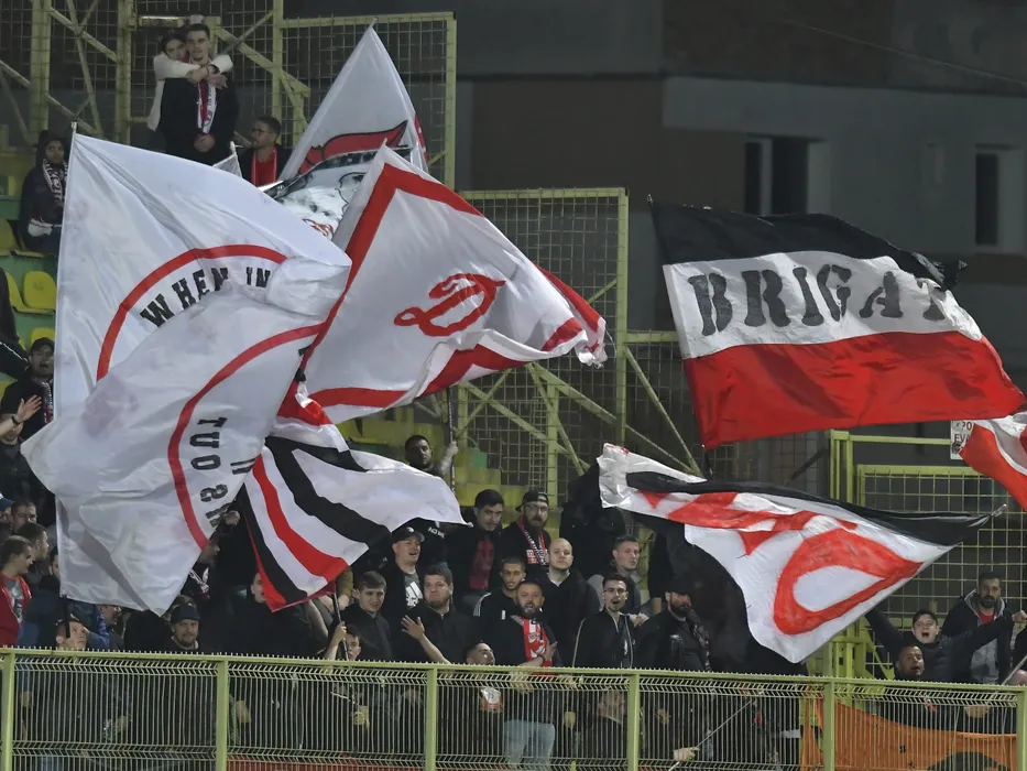 Galeria dinamovista isi incurajeaza favoritii la meciul de fotbal dintre CS Mioveni si Dinamo Bucuresti, contand pentru Play-out-ul Ligii 1 Casa Pariurilor, desfasurat pe Stadionul Orasenesc din Mioveni, vineri 15 aprilie 2022. © FOTO:Razvan Pasarica/SPORT PICTURES