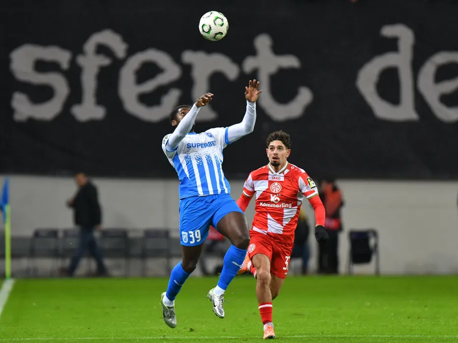 Aimé Steven Nsasa Nsimba si Ben Bobzien in meciul de fotbal dintre Universitatea Craiova si FSV Mainz 05, contand pentru Conference League, desfasurat pe Stadionul Ion Oblemenco din Craiova, joi 27 noiembrie 2025. © FOTO:Daniel George Ilinca/SPORT PICTURES