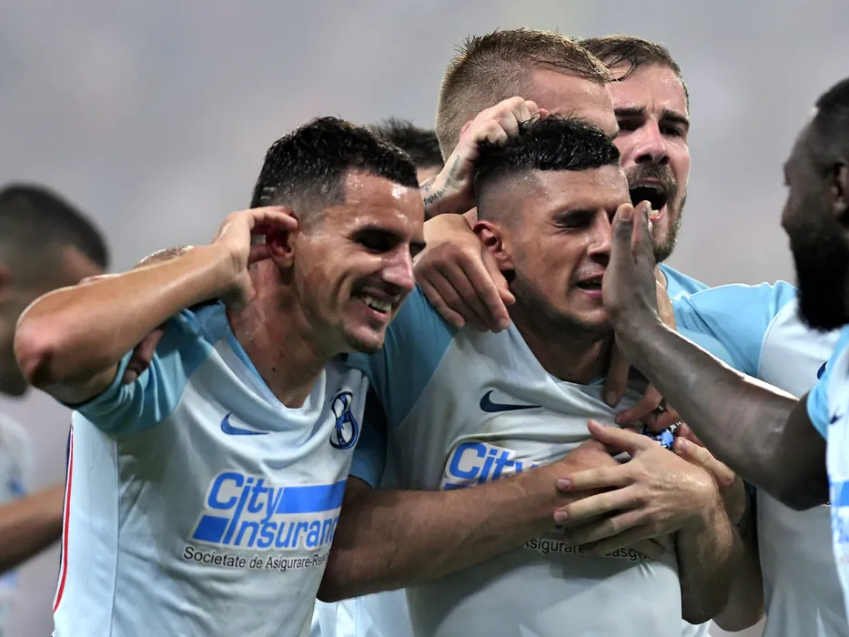 Harlem Gnohere si Romario Benzar il fellicita pe Florinel Coman dupa golul marcat in meciul de fotbal dintre FC Steaua Bucuresti si Dinamo Bucuresti, din etapa a II-a a Ligii 1, disputat pe Arena Nationala din Bucuresti, duminica, 29 iulie 2018.© FOTO:Razvan Pasarica/ Sport Pictures