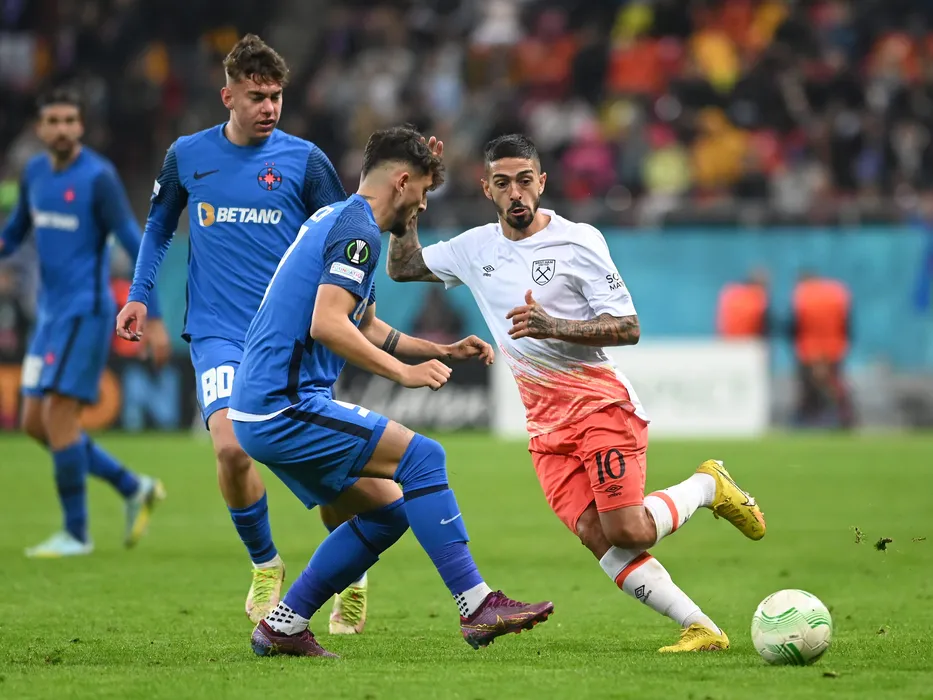 Eduard Gabriel Radaslavescu, Ianis Ilie Stoica si Manuel Lanzini in meciul de fotbal dintre FCSB si West Ham United, din cadrul grupelor UEFA Europa Conference League, desfasurat pe Arena Nationala din Bucuresti, joi 3 noiembrie 2022. © FOTO:Razvan Pasarica/SPORT PICTURES