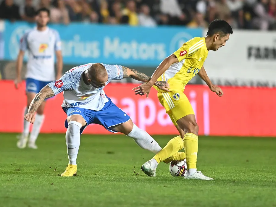 Denis Alibec si Seto Takayuki in meciul de fotbal dintre Petrolul Ploiesti si Farul Constanta, contand pentru Superliga Superbet, desfasurat pe Stadionul Ilie Oana din Ploiesti, vineri 16 septembrie 2022. © FOTO:Razvan Pasarica/SPORT PICTURES