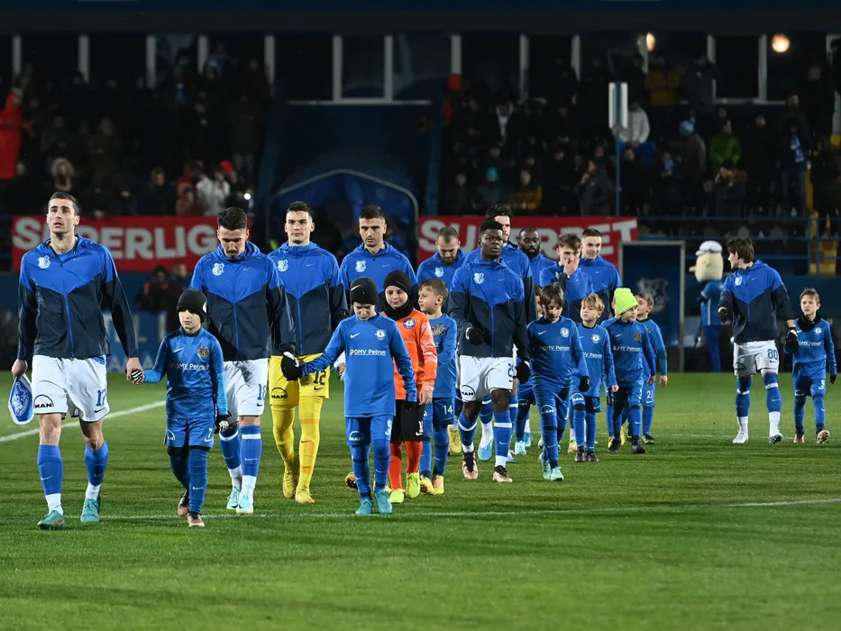 Fotbalistii constanteni in frunte cu Ionut Justinian Larie la startul meciului de fotbal dintre Farul Constanta si CFR Cluj, contand pentru Superliga Superbet, desfasurat pe Stadionul central al Academiei Gheorghe Hagi din Ovidiu, luni 23 ianuarie 2023. © FOTO:Razvan Pasarica/SPORT PICTURES