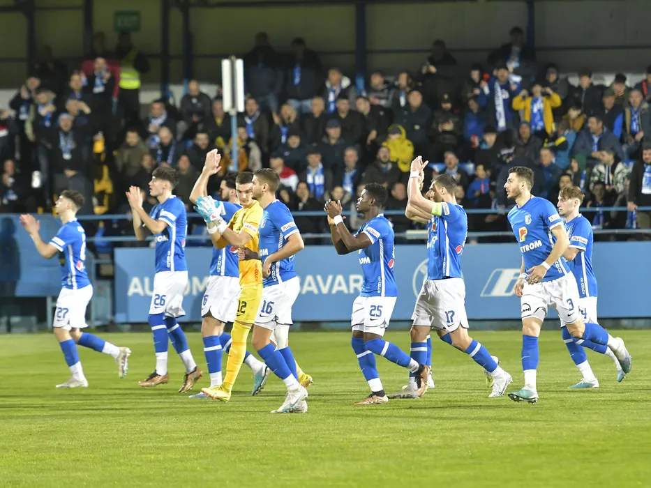 Fotbalistii constanteni printre care Marian Mihai Aioani, Dragos Ionut Nedelcu,Enagnon David Kiki,Ionut Justinian Larie,Mihai Popescu si Constantin Grameni saluta galeria la startul meciului de fotbal dintre Farul Constanta si CFR Cluj, contand pentru Play-off-ul Superligii Superbet, desfasurat pe Stadionul central al Academiei Gheorghe Hagi din Ovidiu, sambata 22 aprilie 2023. © FOTO:Razvan Pasarica/SPORT PICTURES