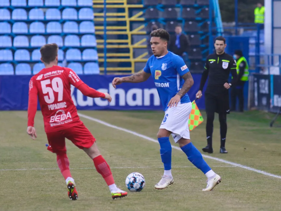 Bradley De Nooijer si Doru Popadiuc in meciul de fotbal dintre FC Farul Constanta si Chindia Targoviste, din cadrul Ligii 1 Casa Pariurilor, desfasurat pe Stadionul Central al Academiei Gheorghe Hagi din Ovidiu, sambata 05 februarie 2022. © FOTO:Sorin Danielciuc/SPORT PICTURES