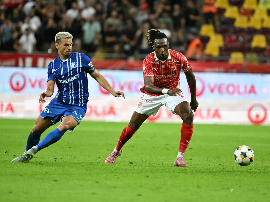Cristian George Ganea si Mamoudou Karamoko in meciul de fotbal dintre Dinamo Bucuresti si Farul Constanta, din cadrul Superligii Superbet, desfasurat pe Arena Nationala din Bucuresti, luni 22 septembrie 2025. © FOTO:Razvan Pasarica/SPORT PICTURES