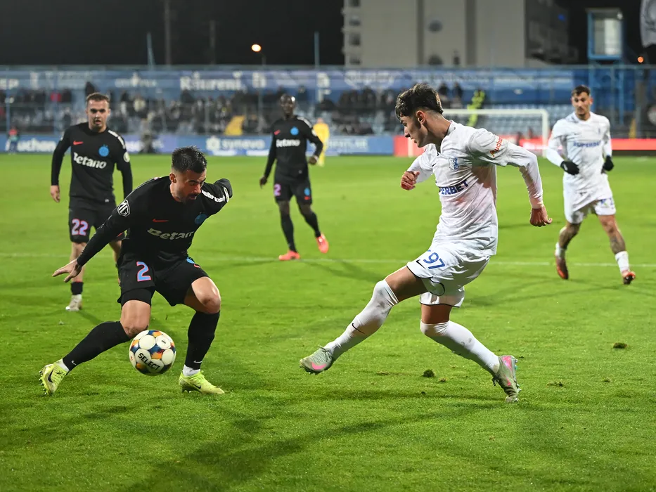 Valentin Cretu si Cristian Sima in meciul de fotbal dintre Farul Constanta si FCSB, contand pentru Superliga Superbet, desfasurat pe Stadionul central al Academiei Gheorghe Hagi din Ovidiu, duminica 30 noiembrie 2025. © FOTO:Razvan Pasarica/SPORT PICTURES