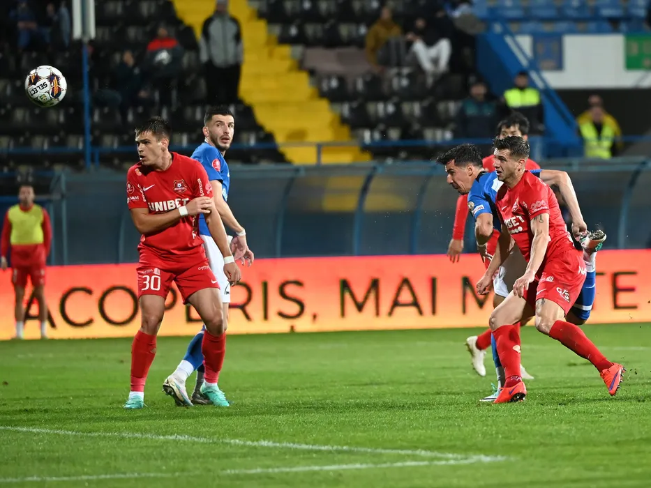 Andrei Viorel Artean marcheaza un gol de langa Mihai Ionut Butean sub privirile lui George Daniel Paraschiv si Mihai Popescu in meciul de fotbal dintre Farul Constanta si FC Hermannstadt, contand pentru Superliga Superbet, desfasurat pe Stadionul central al Academiei Gheorghe Hagi din Ovidiu, sambata 11 noiembrie 2023. © FOTO:Razvan Pasarica/SPORT PICTURES