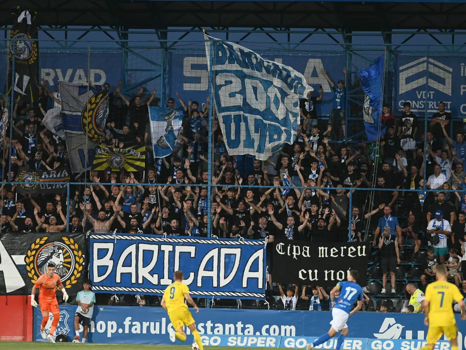 Galeria constanteana cu steaguri si fulare isi incurajeaza favoritii la meciul de fotbal dintre Farul Constanta si HJK Helsinki, contand pentru UEFA Europa Conference League, desfasurat pe Stadionul central al Academiei Gheorghe Hagi din Ovidiu, joi 24 august 2023. © FOTO:Razvan Pasarica/SPORT PICTURES