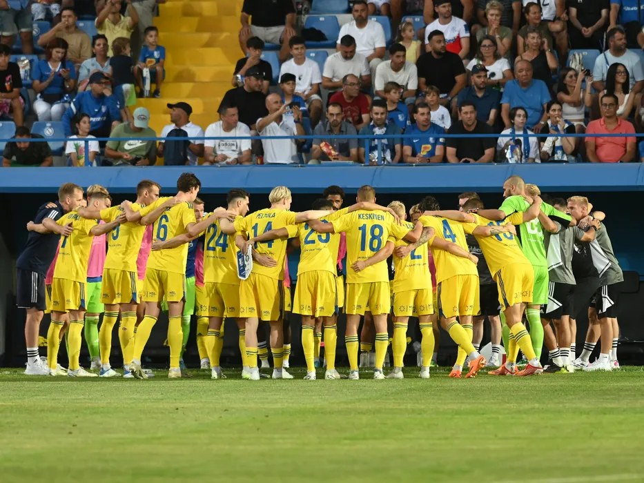 Fotbalistii finlandezi se incurajeaza inaintea meciului de fotbal dintre Farul Constanta si HJK Helsinki, contand pentru UEFA Europa Conference League, desfasurat pe Stadionul central al Academiei Gheorghe Hagi din Ovidiu, joi 24 august 2023. © FOTO:Razvan Pasarica/SPORT PICTURES