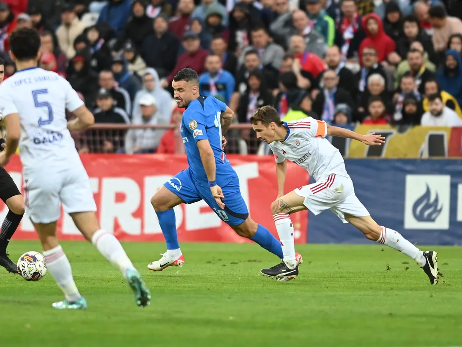 Constantin Valentin Budescu si Juri Cisotti in meciul de fotbal dintre Otelul Galati si Farul Constanta, din cadrul Superligii Superbet, desfasurat pe Stadionul Otelul din Galati, duminica 8 octombrie 2023. © FOTO:Razvan Pasarica/SPORT PICTURES