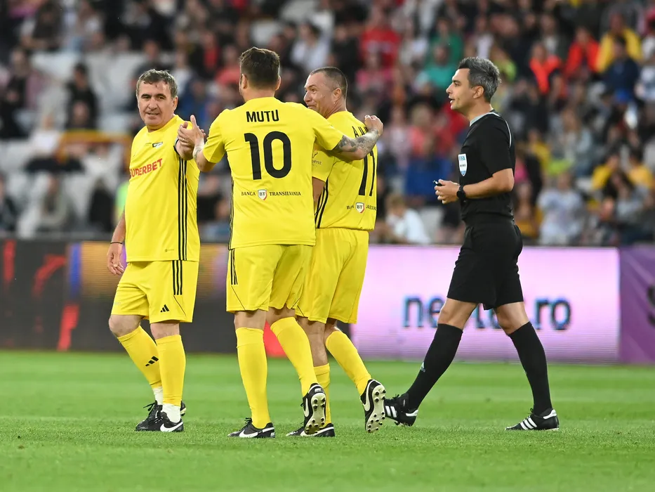 Gheorghe Hagi si Adrian Ilieil felicita pe Adrian Mutu dupa un gol marcat alaturi de arbitrul central Horatiu Fesnic la meciul amical de fotbal dintre All Stars Romania si Galatasaray Legends, din cadrul Sports Festival, desfasurat pe Cluj Arena din Cluj Napoca, vineri 2 iunie 2023. © FOTO:Razvan Pasarica/SPORT PICTURES