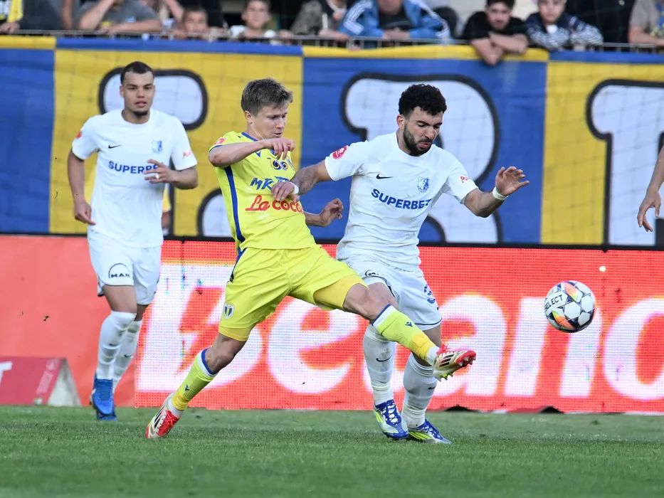Tommi Matti Jyry si Narek Grigoryan in meciul de fotbal dintre Petrolul Ploiesti si Farul Constanta, din cadrul Play out-ul Superligii Superbet desfasurat pe Stadionul Ilie Oana din Ploiesti, luni 28 aprilie 2025. © FOTO:Razvan Pasarica/SPORT PICTURES