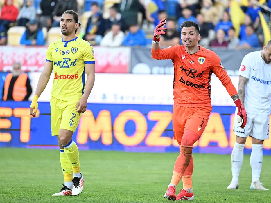 Fotbaliștii ploieșteni Marian Fernando Huja si Andrei Raul Barbalau reacționează in meciul de fotbal dintre Petrolul Ploiesti si Farul Constanta, din cadrul Play out-ul Superligii Superbet desfasurat pe Stadionul Ilie Oana din Ploiesti, luni 28 aprilie 2025. © FOTO:Razvan Pasarica/SPORT PICTURES