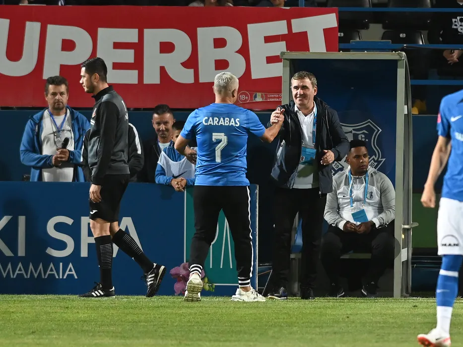 Stelian Carabas il saluta pe Gheorghe Hagi alaturi de arbitrul de rezerva Robert Avram inaintea meciului de fotbal dintre Farul Constanta si Sepsi OSK Sfantu Gheorghe, contand pentru Superliga Superbet, desfasurat pe Stadionul central al Academiei Gheorghe Hagi din Ovidiu, sambata 30 septembrie 2023. © FOTO:Razvan Pasarica/SPORT PICTURES