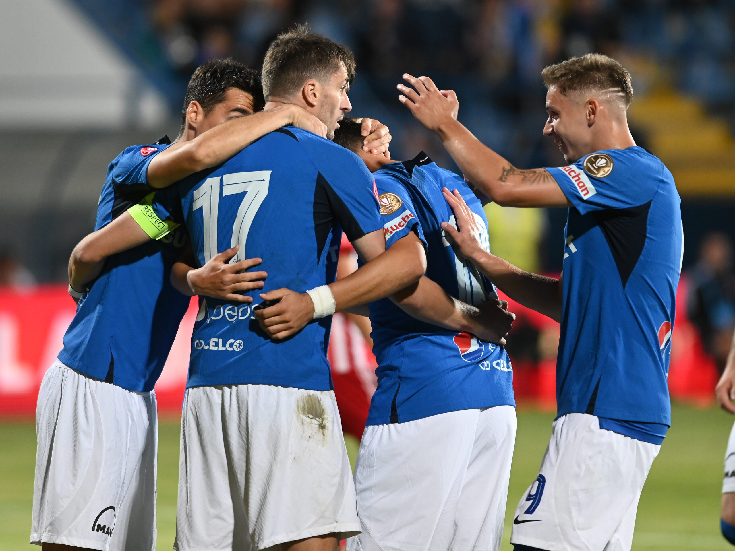 Bucurie a fotbalistilor constanteni dupa un gol marcatcu Andrei Viorel Artean si Constantin Grameni in meciul de fotbal dintre Farul Constanta si Sepsi OSK Sfantu Gheorghe, contand pentru Superliga Superbet, desfasurat pe Stadionul central al Academiei Gheorghe Hagi din Ovidiu, sambata 30 septembrie 2023. © FOTO:Razvan Pasarica/SPORT PICTURES