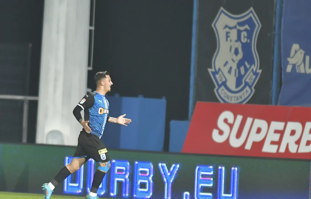 Jovan Markovic se bucura dupa un gol marcat in meciul de fotbal dintre Farul Constanta si Universitatea Craiova, contand pentru Play-off-ul Ligii 1 Casa Pariurilor, desfasurat pe Stadionul central al Academiei Gheorghe Hagi din Ovidiu, sambata 16 aprilie 2022. © FOTO:Razvan Pasarica/SPORT PICTURES