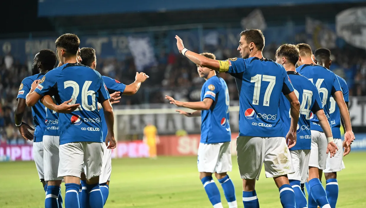 Bucurie a fotbalistilor craioveni dupa un gol marcat cu Ionut Justinian Larie si Adrian Mazilu in meciul de fotbal dintre Farul Constanta si Universitatea Craiova, contand pentru Superliga Superbet, desfasurat pe Stadionul central al Academiei Gheorghe Hagi din Ovidiu, duminica 27 august 2023. © FOTO:Razvan Pasarica/SPORT PICTURES