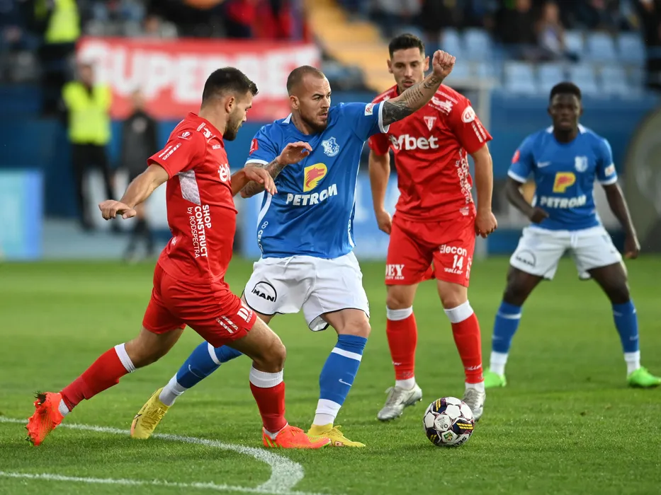 Andrei Chindris si Denis Alibec in meciul de fotbal dintre Farul Constanta si UTA Arad, contand pentru Superliga Superbet, desfasurat pe Stadionul central al Academiei Gheorghe Hagi din Ovidiu, duminica 2 octombrie 2022. © FOTO:Razvan Pasarica/SPORT PICTURES