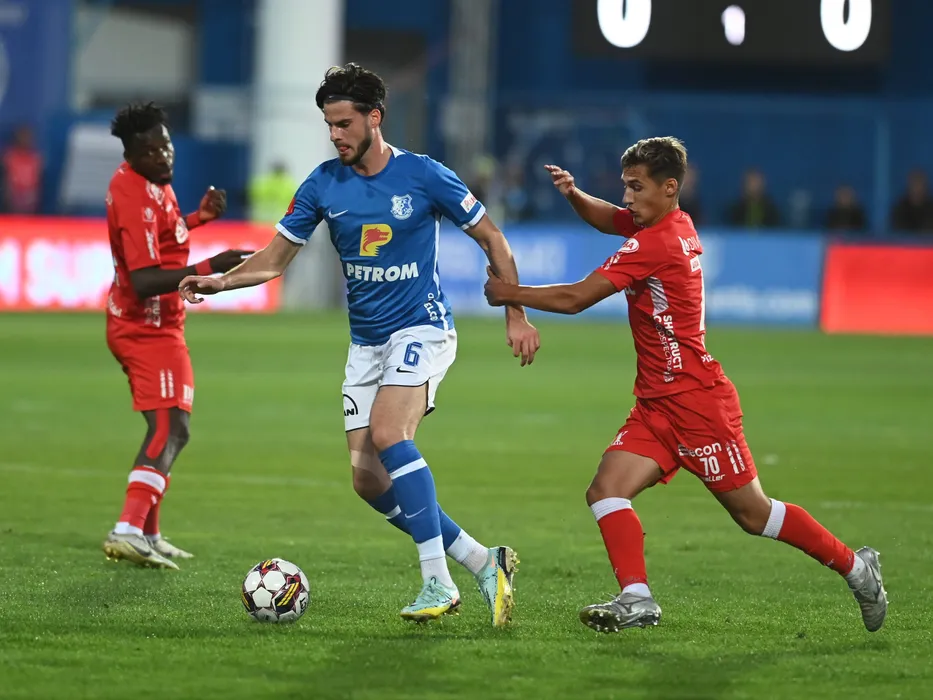 Tudor Cristian Baluta si Raul Ovidiu Steau in meciul de fotbal dintre Farul Constanta si UTA Arad, contand pentru Superliga Superbet, desfasurat pe Stadionul central al Academiei Gheorghe Hagi din Ovidiu, duminica 2 octombrie 2022. © FOTO:Razvan Pasarica/SPORT PICTURES