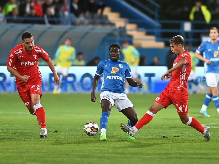 Paul Viorel Anton, Kevin Doukoure Grobry si Raul Ovidiu Steau in meciul de fotbal dintre Farul Constanta si UTA Arad, contand pentru Superliga Superbet, desfasurat pe Stadionul central al Academiei Gheorghe Hagi din Ovidiu, duminica 2 octombrie 2022. © FOTO:Razvan Pasarica/SPORT PICTURES