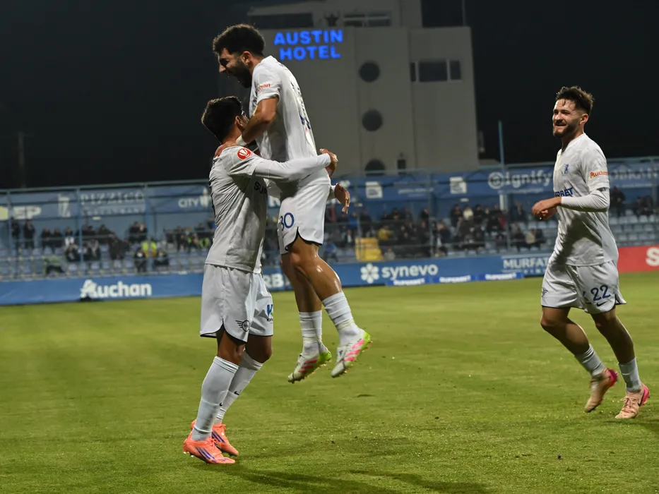 Ionuț Daniel Vână se bucură dupa un gol marcat alături de Narek Grigoryan si Dan Sîrbu in meciul de fotbal dintre Farul Constanta si FK Csikszereda Miercurea Ciuc, contand pentru Superliga Superbet, desfasurat pe Stadionul central al Academiei Gheorghe Hagi din Ovidiu, luni 3 noiembrie 2025. © FOTO:Razvan Pasarica/SPORT PICTURES