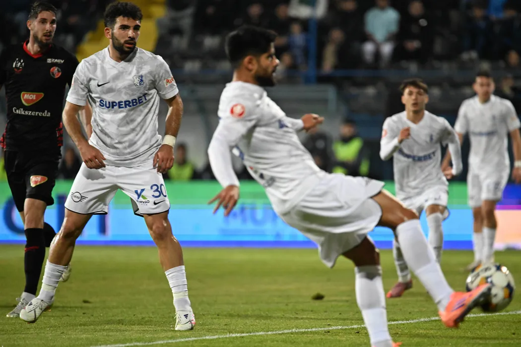 Ionuț Daniel Vână marchează un gol sub privirile lui Narek Grigoryan in meciul de fotbal dintre Farul Constanta si FK Csikszereda Miercurea Ciuc, contand pentru Superliga Superbet, desfasurat pe Stadionul central al Academiei Gheorghe Hagi din Ovidiu, luni 3 noiembrie 2025. © FOTO:Razvan Pasarica/SPORT PICTURES