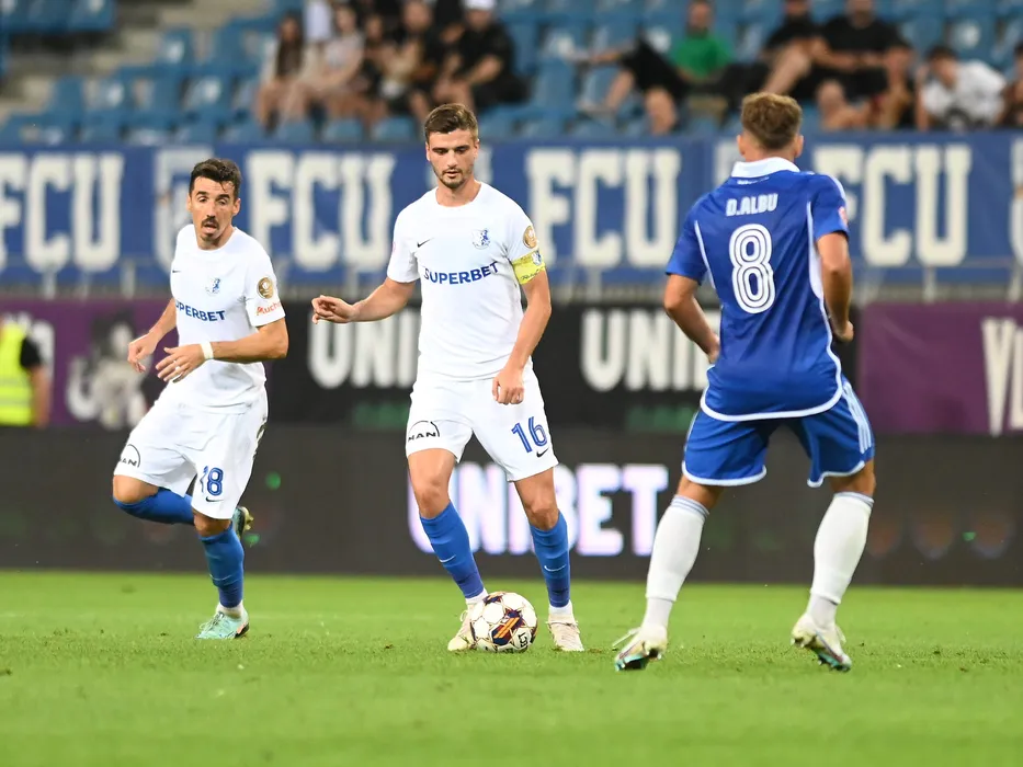 Andrei Viorel Artean si Dragos Ionut Nedelcu in meciul de fotbal dintre FC U Craiova si Farul Constanta, contand pentru Superliga Superbet, desfasurat pe Stadionul Ion Oblemenco din Craiova, duminica 3 septembrie 2023. © FOTO:Razvan Pasarica/SPORT PICTURES