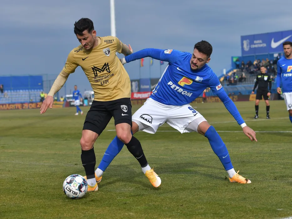 Ricardo Jose Veiga Varzim Miranda si Adrian Petre Tabarcea in meciul de fotbal dintre Farul Constanta si FC Voluntari, contand pentru Liga 1 Casa Pariurilor, desfasurat pe Stadionul central al Academiei Gheorghe Hagi din Ovidiu, sambata 12 februarie 2022. © FOTO:Razvan Pasarica/SPORT PICTURES