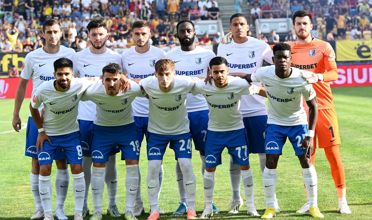 Fotbalistii constanteni la o fotografie de grup realizata inaintea meciului de fotbal dintre Petrolul Ploiesti si Farul Constanta, din cadrul Superligii Superbet, desfasurat pe Stadionul Ilie Oana din Ploiesti, duminica 6 august 2023. © FOTO:Razvan Pasarica/SPORT PICTURES