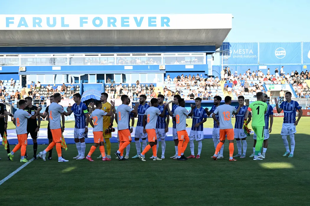 Fotbalistii celor doua echipe se saluta inaintea meciului de fotbal dintre Farul Constanta si Metaloglobus Bucuresti, contand pentru Superliga Superbet, desfasurat pe Stadionul central al Academiei Gheorghe Hagi din Ovidiu, vineri 1 august 2025. © FOTO:Razvan Pasarica/SPORT PICTURES