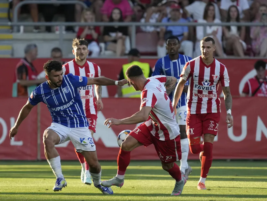 Narek Grigoryan si Ovidiu Marian Popescu, Andrea Padula in meciul de fotbal dintre UTA Arad si Farul Constanta, contand pentru Superliga Superbet, desfasurat pe Arena Francisc Neuman din Arad, sambata 9 august 2025. © FOTO:Alexandra Fechete/SPORT PICTURES