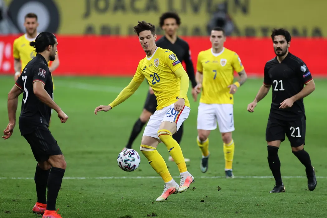 Dennis Man (C), de la nationala de fotbal a Romaniei, suteaza in timpul meciului Romania - Germania din etapa a doua a preliminariilor Campionatului Mondial, disputat pe Arena Nationala din Bucuresti, duminica, 28 martie 2021. SEBASTIAN TATARU / MEDIAFAX FOTO