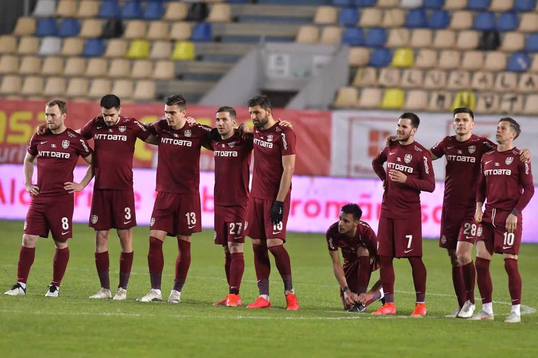 Fotbalistii clujeni Runar Mar S Sigurjonsson, Andrei Andonie Burca, Denis Ciobotariu, Alexandru Mihaita Chipciu, Syam Habib Ben Youssef, Constantin Adrian Paun, Ovidiu Stefan Hoban si Ciprian Ioan Deac la penalty-uri in meciul de fotbal dintre CFR Cluj si FCSB, Supercupa Romaniei, desfasurat fara spectatori pe Stadionul Ilie Oana din Ploiesti, joi 15 aprilie 2021. © FOTO:Razvan Pasarica/SPORT PICTURES