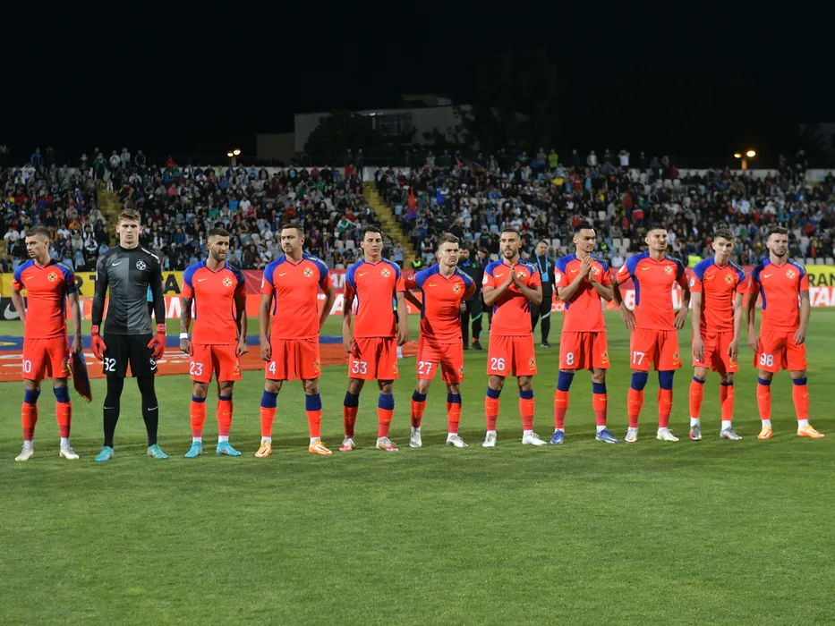 Fotbalistii stelisti la startul meciului de fotbal dintre FCSB si CFR Cluj, contand pentru Play-off-ul Ligii 1 Casa Pariurilor, desfasurat pe Stadionul Gloria din Buzau, duminica 22 mai 2022. © FOTO:Razvan Pasarica/SPORT PICTURES