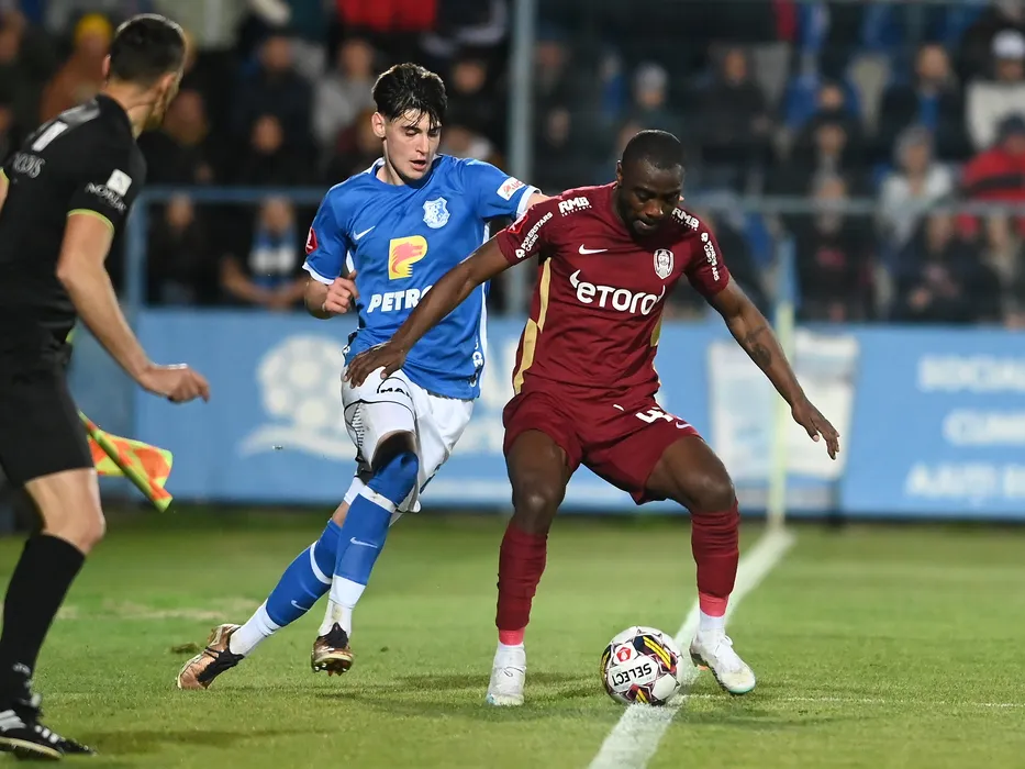 Adrian Mazilu si Christopher Braun in meciul de fotbal dintre Farul Constanta si CFR Cluj, contand pentru Play-off-ul Superligii Superbet, desfasurat pe Stadionul central al Academiei Gheorghe Hagi din Ovidiu, sambata 22 aprilie 2023. © FOTO:Razvan Pasarica/SPORT PICTURES