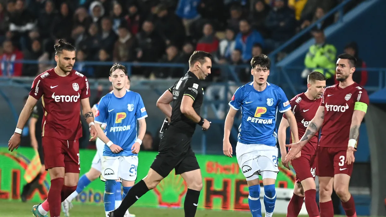 Adrian Mazilu si Constantin Grameni reactioneaza alaturi de Andonie Andrei Burca in meciul de fotbal dintre Farul Constanta si CFR Cluj, contand pentru Play-off-ul Superligii Superbet, desfasurat pe Stadionul central al Academiei Gheorghe Hagi din Ovidiu, sambata 22 aprilie 2023. © FOTO:Razvan Pasarica/SPORT PICTURES