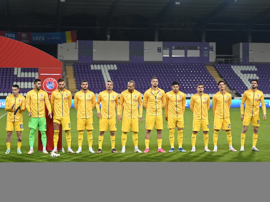 Fotbalistii romani la startul meciului de fotbal dintre Belarus si Romania, din cadrul preliminariilor Campionatului European 2024, desfasurat pe Stadionul Szusza Ferenc din Budapesta, joi 12 octombrie 2023. © FOTO:Razvan Pasarica/SPORT PICTURES
